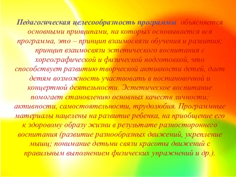 Слайд 10Педагогическая целесообразность программы объясняется основными принципами, на которых основывается вся программа,