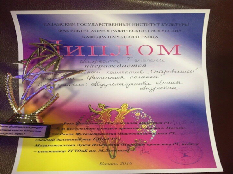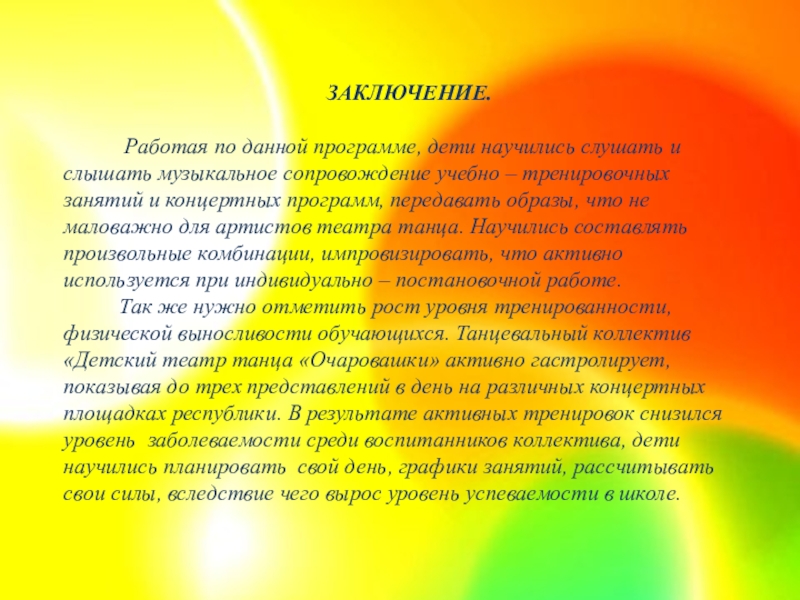Так же нужно отметить рост уровня тренированности, физической выносливости обучающихся. Танцевальный коллектив «Детский театр танца «Очаровашки» активно гастролирует, показывая до трех представлений в день на различных концертных площадках республики. В результате активных тренировок снизился уровень заболеваемости среди воспитанников коллектива, дети научились планировать свой день, графики занятий, рассчитывать свои силы, вследствие чего вырос уровень успеваемости в школе.
