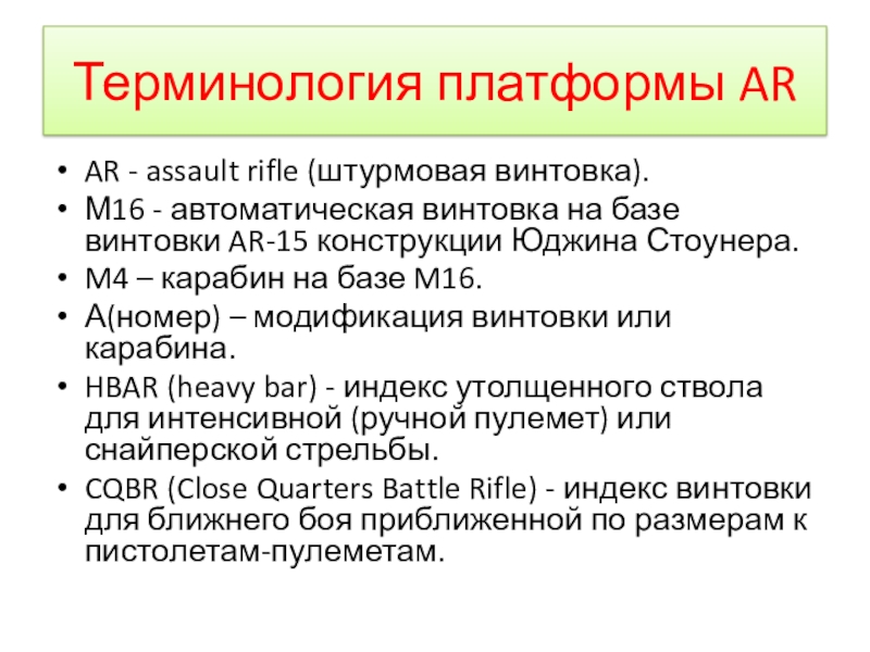 Терминология платформы ARAR - assault rifle (штурмовая винтовка).М16 - автоматическая винтовка на базе винтовки AR-15 конструкции Юджина Стоунера.M4