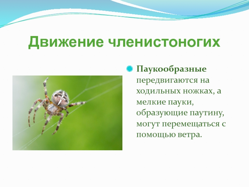Паукообразные передвигаются на ходильных ножках, а мелкие пауки, образующие паутину,