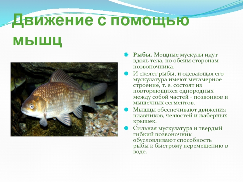 Мышцы обеспечивают движения плавников, челюстей и жаберных крышек.
