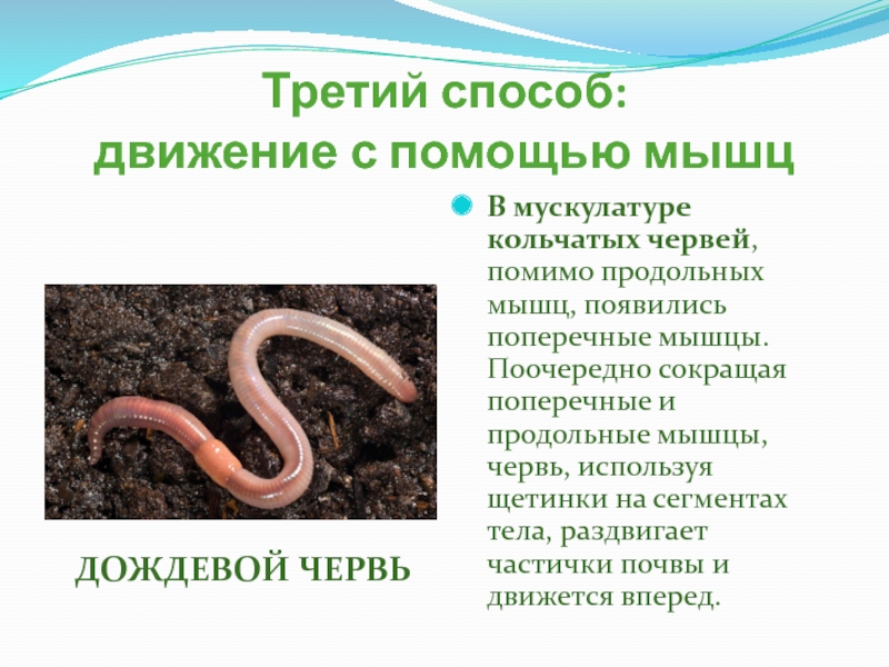 мышц, появились поперечные мышцы. Поочередно сокращая поперечные и продольные мышцы, червь, используя щетинки на сегментах тела, раздвигает частички почвы и движется вперед.