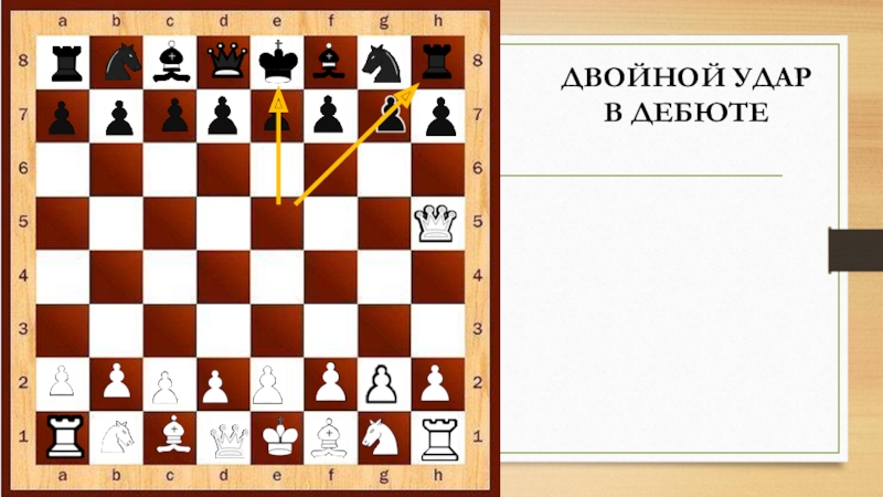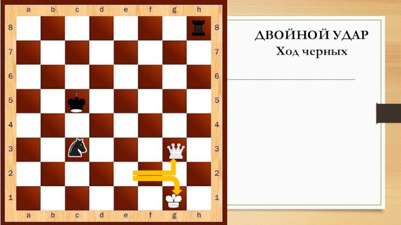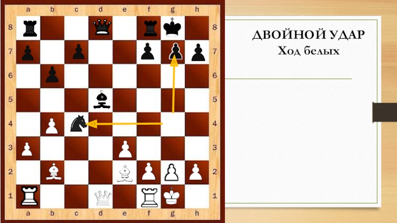 ДВОЙНОЙ УДАР- это тактический прием, при котором фигура (пешка) одновременно нападает на две фигуры (пешки) соперника. ПРИМЕР:Ход