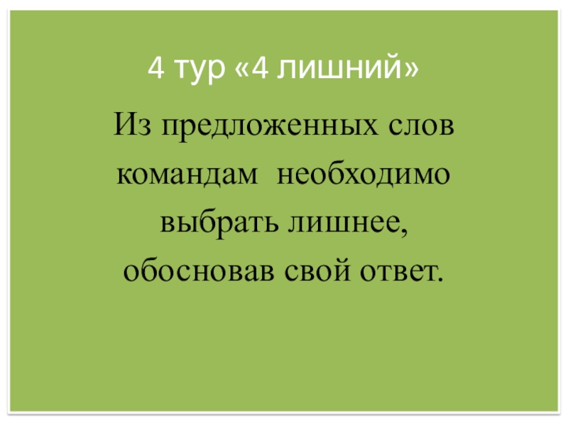 4 тур «4 лишний»       Из предложенных слов командам необходимо выбрать лишнее,