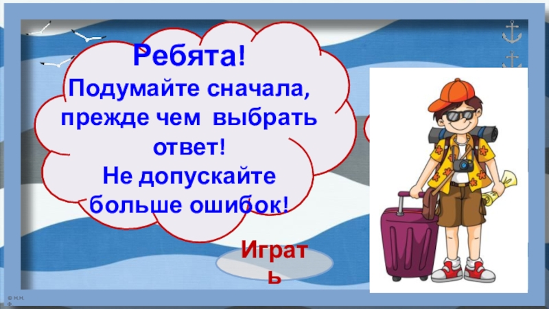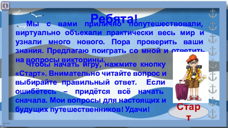 Чтобы начать игру, нажмите кнопку «Старт». Внимательно читайте вопрос и выбирайте правильный ответ. Если ошибётесь – придётся всё начать сначала. Мои вопросы для настоящих и будущих путешественников! Удачи!