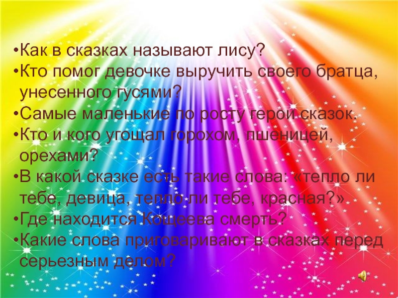 Как в сказках называют лису? Кто помог девочке выручить своего братца, унесенного гусями? Самые маленькие по росту
