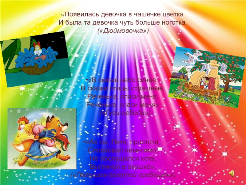 «Появилась девочка в чашечке цветкаИ была та девочка чуть больше ноготка. («Дюймовочка»)«В сказке небо синее,В сказке птицы