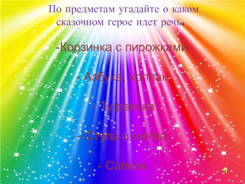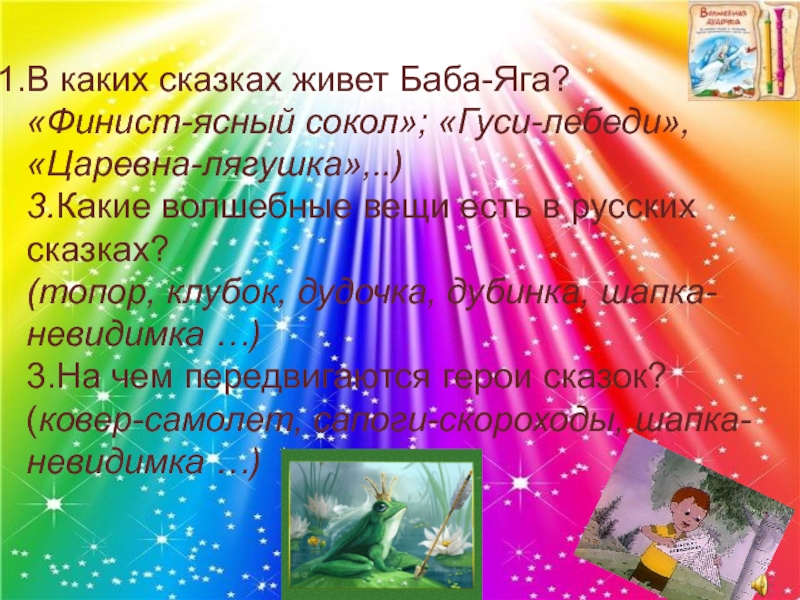В каких сказках живет Баба-Яга? «Финист-ясный сокол»; «Гуси-лебеди», «Царевна-лягушка»,..)3.Какие волшебные вещи есть в русских сказках? (топор, клубок, дудочка, дубинка, шапка-невидимка …)3.На чем передвигаются герои сказок? (ковер-самолет, сапоги-скороходы, шапка-невидимка …)