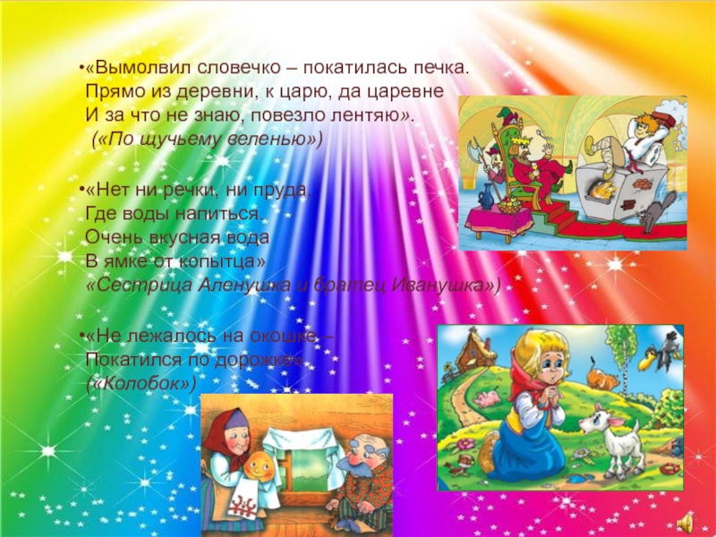 «Вымолвил словечко – покатилась печка.Прямо из деревни, к царю, да царевнеИ за что не знаю, повезло