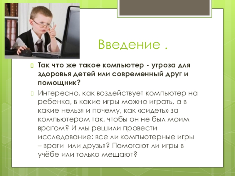 Интересно, как воздействует компьютер на ребенка, в какие игры можно играть, а в какие нельзя и почему, как «сидеть» за компьютером так, чтобы он не был моим врагом? И мы решили провести исследование: все ли компьютерные игры – враги или друзья? Помогают ли игры в учёбе или только мешают?