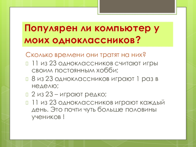 11 из 23 одноклассников играют каждый день. Это почти чуть больше половины учеников !