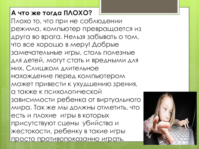 превращается из друга во врага. Нельзя забывать о том, что все хорошо в меру! Добрые замечательные игры, столь полезные для детей, могут стать и вредными для них. Слишком длительное нахождение перед компьютером может привести к ухудшению зрения, а также к психологической зависимости ребенка от виртуального мира. Так же мы должны отметить, что есть и плохие игры в которых присутствуют сцены убийства и жестокости, ребенку в такие игры просто противопоказанно играть.