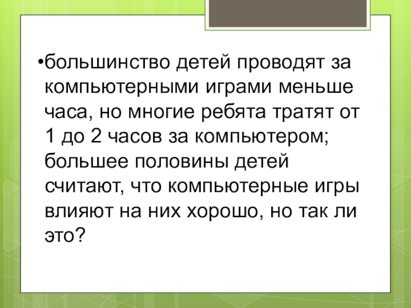 Слайд 9большинство детей проводят за компьютерными играми меньше часа, но многие ребята