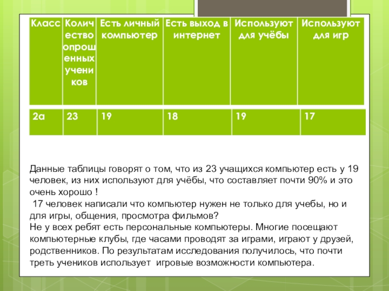 Слайд 5Данные таблицы говорят о том, что из 23 учащихся компьютер есть