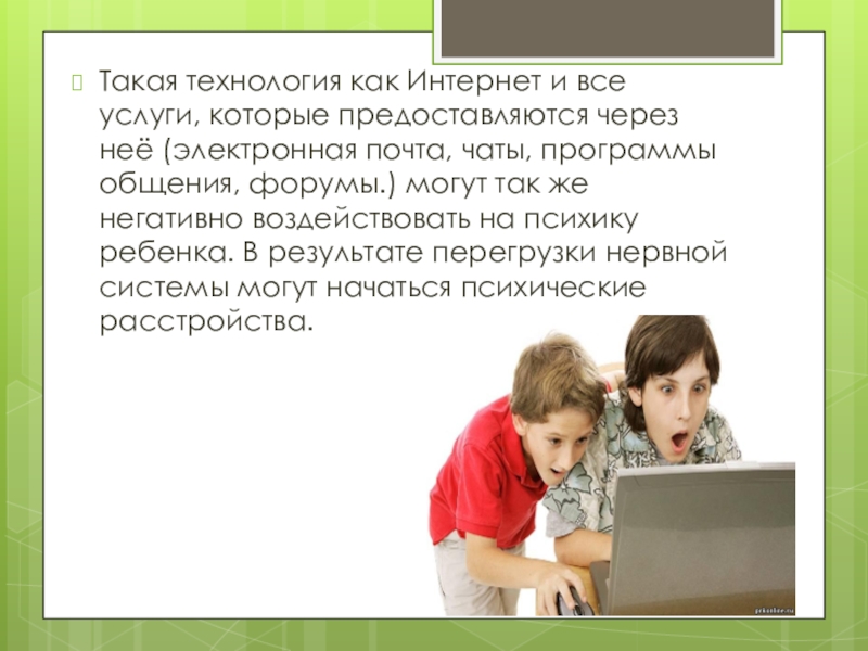 (электронная почта, чаты, программы общения, форумы.) могут так же негативно воздействовать на психику ребенка. В результате перегрузки нервной системы могут начаться психические расстройства.