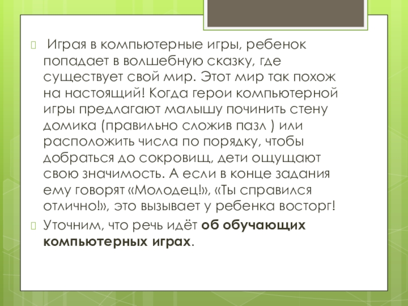 существует свой мир. Этот мир так похож на настоящий! Когда герои компьютерной игры предлагают малышу починить стену домика (правильно сложив пазл ) или расположить числа по порядку, чтобы добраться до сокровищ, дети ощущают свою значимость. А если в конце задания ему говорят «Молодец!», «Ты справился отлично!», это вызывает у ребенка восторг!