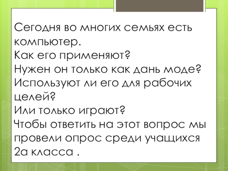 Чтобы ответить на этот вопрос мы провели опрос среди учащихся 2а класса .