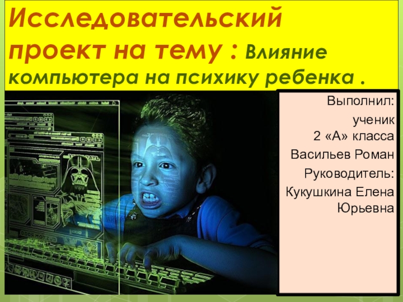 Слайд 1Исследовательский проект на тему : Влияние компьютера на психику ребенка .