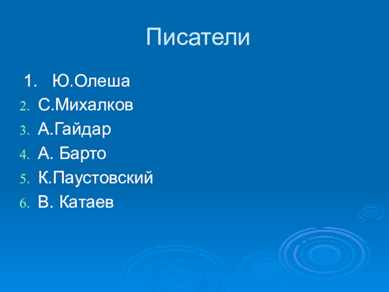 Писатели1.  Ю.ОлешаС.МихалковА.ГайдарА. БартоК.ПаустовскийВ. Катаев