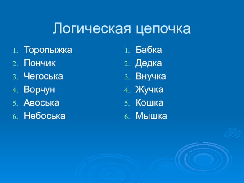 Логическая цепочкаТоропыжкаПончикЧегоськаВорчунАвоськаНебоськаБабкаДедкаВнучкаЖучкаКошкаМышка