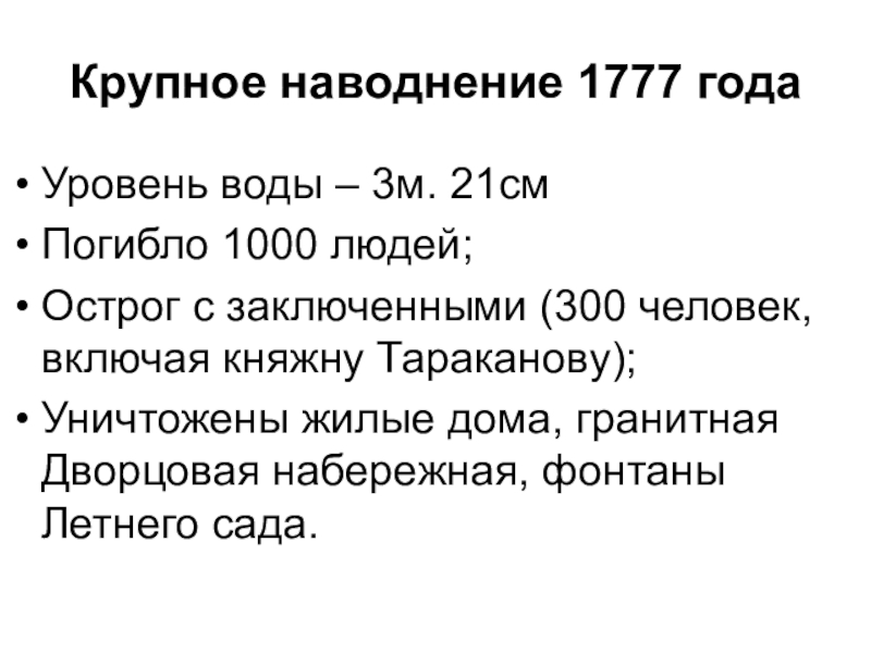 не бывало. У меня в хоромах было сверху пола 21 дюйм и по городу и по другой стороне по улице свободно ездили на лодках. И здесь было утешно смотреть, что люди по кровлям и по деревьям, будто во время потопа, сидели — не только мужики, но и бабы».