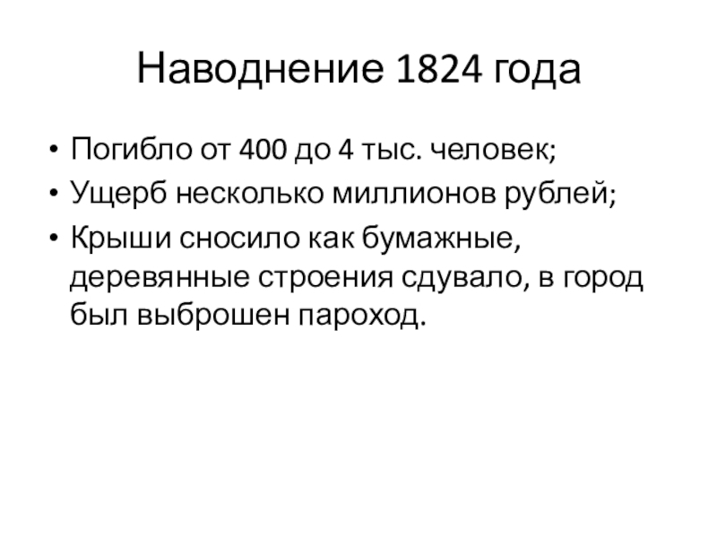 воду, поспешили на берега Невы полюбоваться стихией. Через несколько часов Нева, а также другие реки и каналы, вышли из берегов даже там, где были высокие набережные. Весь город, за исключением Литейной и Рождественской частей, был залит водой почти в рост человека.