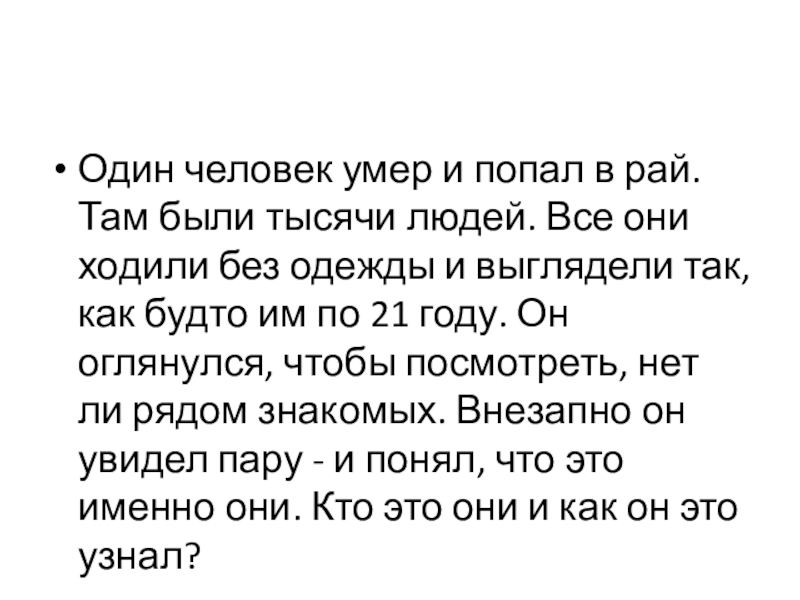 Слайд 15Один человек умер и попал в рай. Там были тысячи людей.