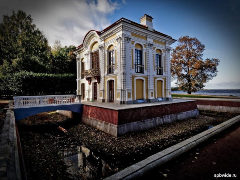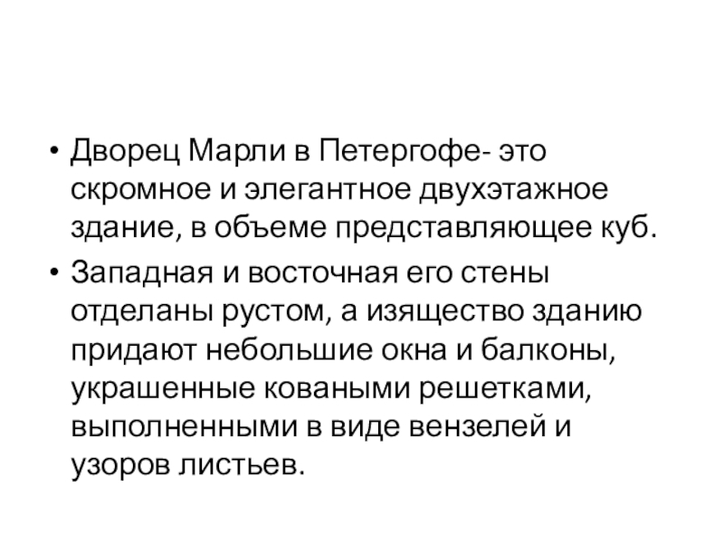 Слайд 18Дворец Марли в Петергофе- это скромное и элегантное двухэтажное здание, в объеме