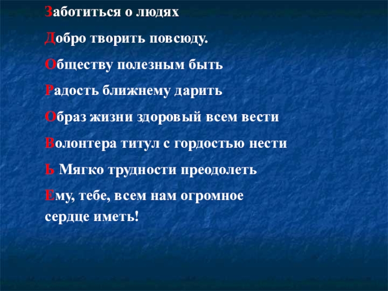 Заботиться о людяхДобро творить повсюду.Обществу полезным бытьРадость ближнему даритьОбраз жизни здоровый всем вестиВолонтера титул с гордостью нестиЬ Мягко