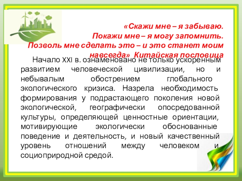 Начало XXI в. ознаменовано не только ускоренным развитием человеческой цивилизации, но и небывалым обострением глобального экологического кризиса. Назрела необходимость формирования у подрастающего поколения новой экологической, географически опосредованной культуры, определяющей ценностные ориентации, мотивирующие экологически обоснованные поведение и деятельность, и новый качественный уровень отношений между человеком и социоприродной средой.