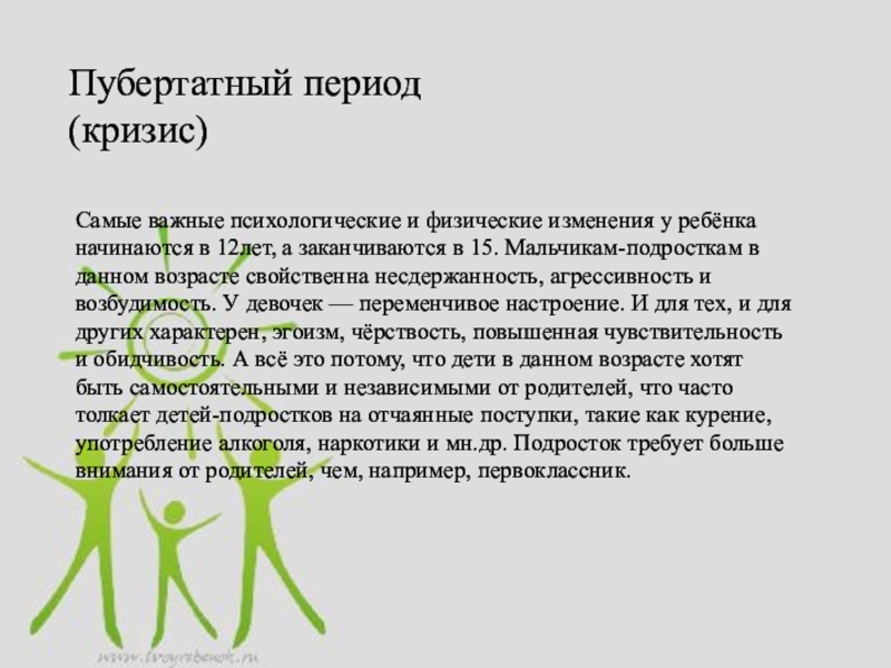 в 12лет, а заканчиваются в 15. Мальчикам-подросткам в данном возрасте свойственна несдержанность, агрессивность и возбудимость. У девочек — переменчивое настроение. И для тех, и для других характерен, эгоизм, чёрствость, повышенная чувствительность и обидчивость. А всё это потому, что дети в данном возрасте хотят быть самостоятельными и независимыми от родителей, что часто толкает детей-подростков на отчаянные поступки, такие как курение, употребление алкоголя, наркотики и мн.др. Подросток требует больше внимания от родителей, чем, например, первоклассник.