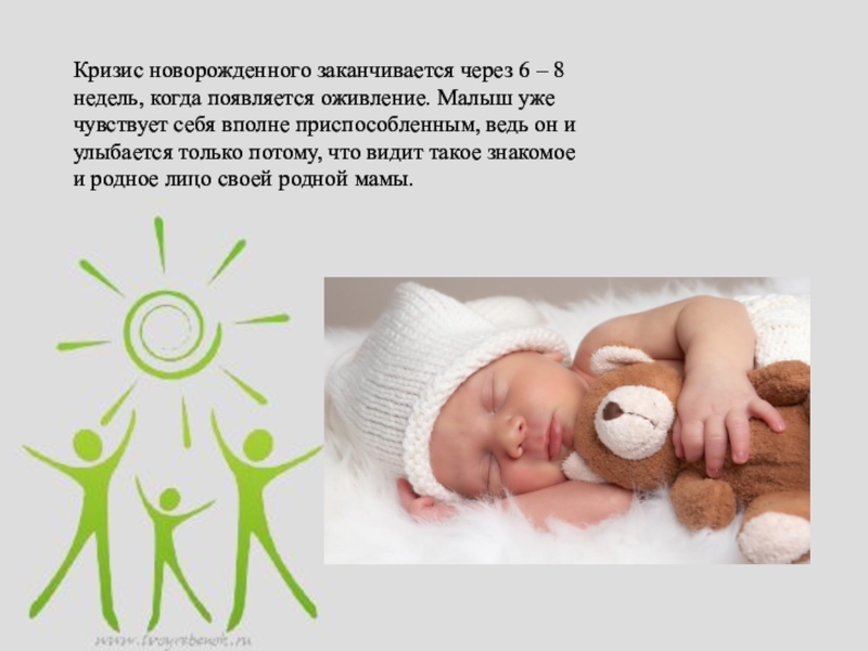 Слайд 7Кризис новорожденного заканчивается через 6 – 8 недель, когда появляется оживление.