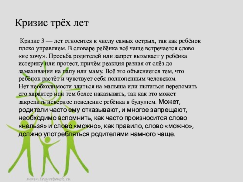 как ребёнок плохо управляем. В словаре ребёнка всё чаще встречается слово «не хочу». Просьба родителей или запрет вызывает у ребёнка истерику или протест, причём реакция разная от слёз до замахивания на папу или маму. Всё это объясняется тем, что ребёнок растёт и чувствует себя полноценным человеком.