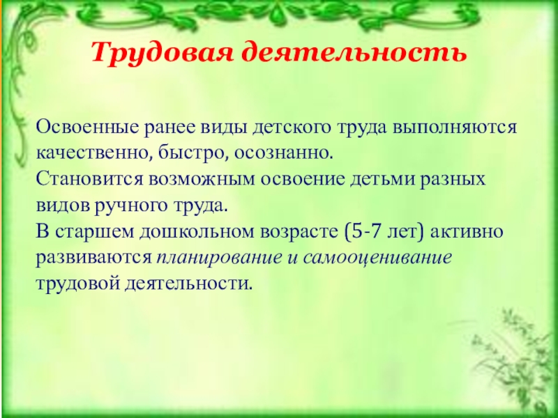 В старшем дошкольном возрасте (5-7 лет) активно развиваются планирование и самооценивание трудовой деятельности.