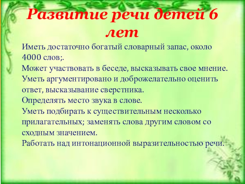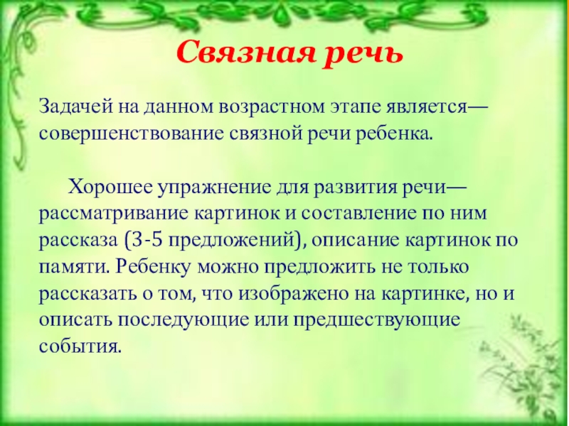 Задачей на данном возрастном этапе является—совершенствование связной речи ребенка.