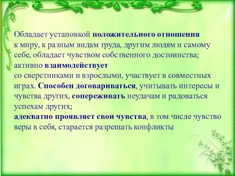 и самому себе, обладает чувством собственного достоинства; активно взаимодействует