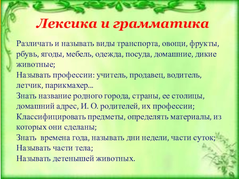 Знать название родного города, страны, ее столицы, домашний адрес, И. О. родителей, их профессии;