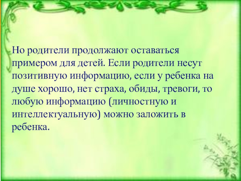 Слайд 16Но родители продолжают оставаться примером для детей. Если родители несут позитивную