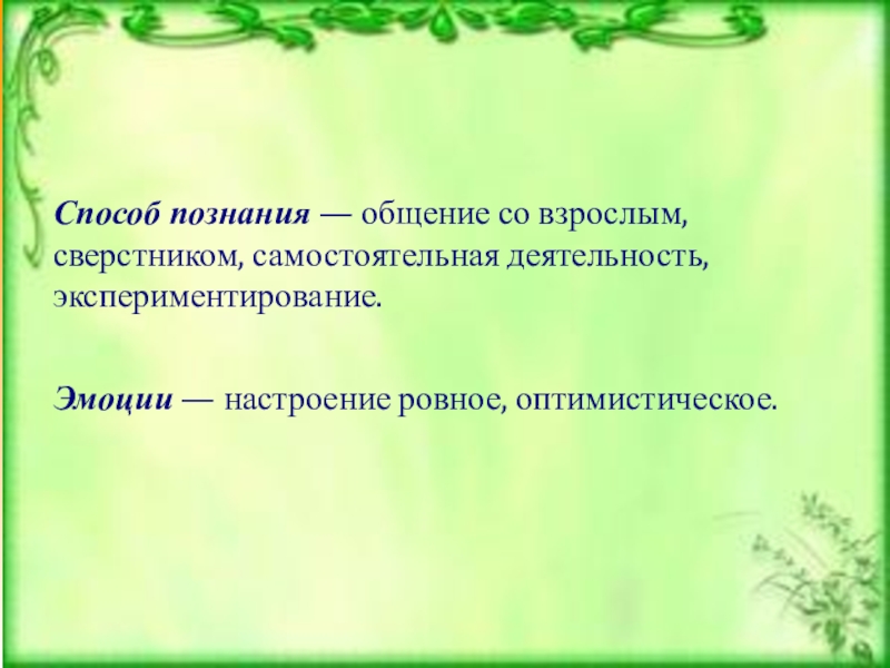 Слайд 6Способ познания — общение со взрослым, сверстником, самостоятельная деятельность, экспериментирование.