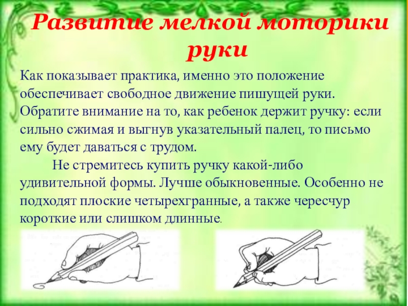 свободное движение пишущей руки. Обратите внимание на то, как ребенок держит ручку: если сильно сжимая и выгнув указательный палец, то письмо ему будет даваться с трудом.