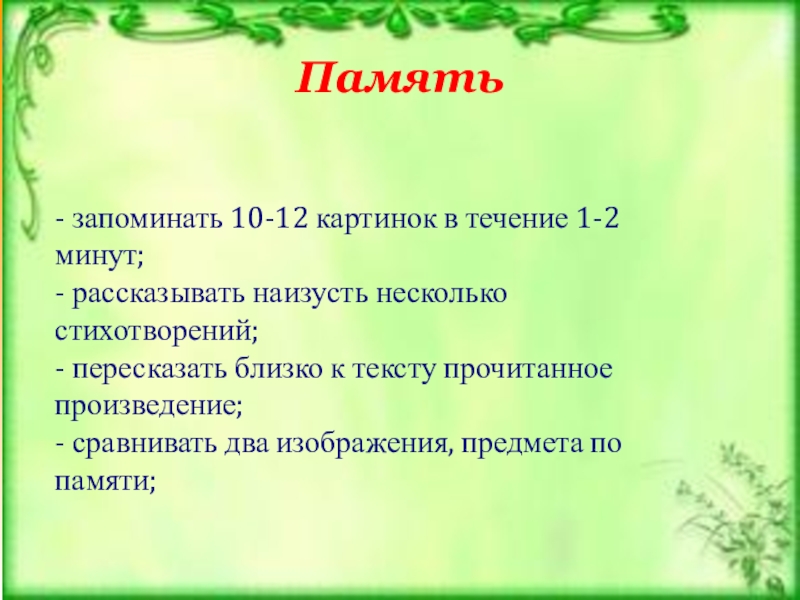 - запоминать 10-12 картинок в течение 1-2 минут;