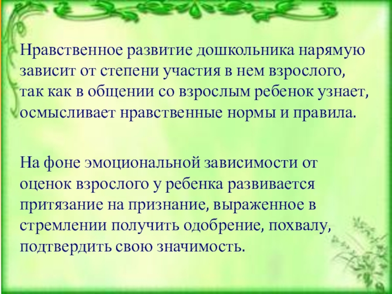 Слайд 14Нравственное развитие дошкольника нарямую зависит от степени участия в нем взрослого,
