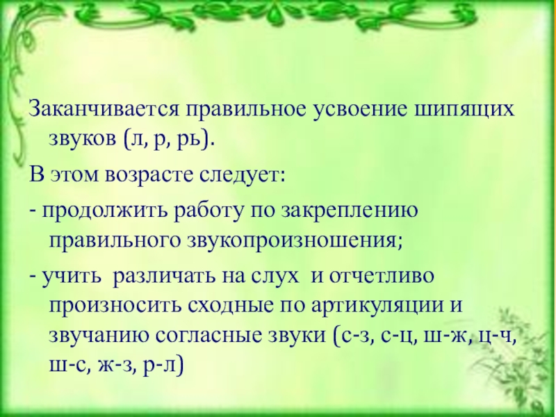 Заканчивается правильное усвоение шипящих звуков (л, р, рь).