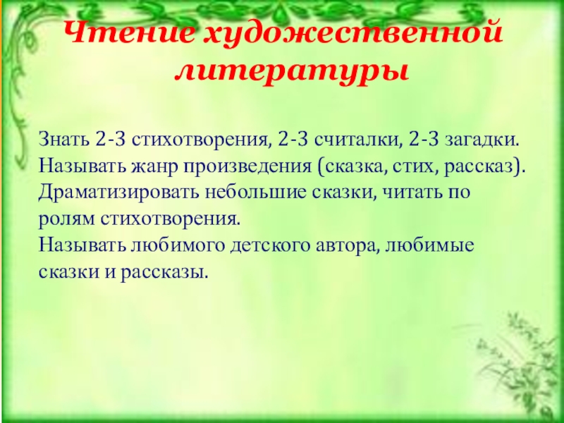 Драматизировать небольшие сказки, читать по ролям стихотворения.