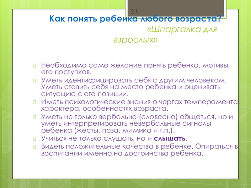 Уметь не только вербально (словесно) общаться, но и уметь интерпретировать невербальные сигналы ребенка (жесты, поза, мимика и т.п.).