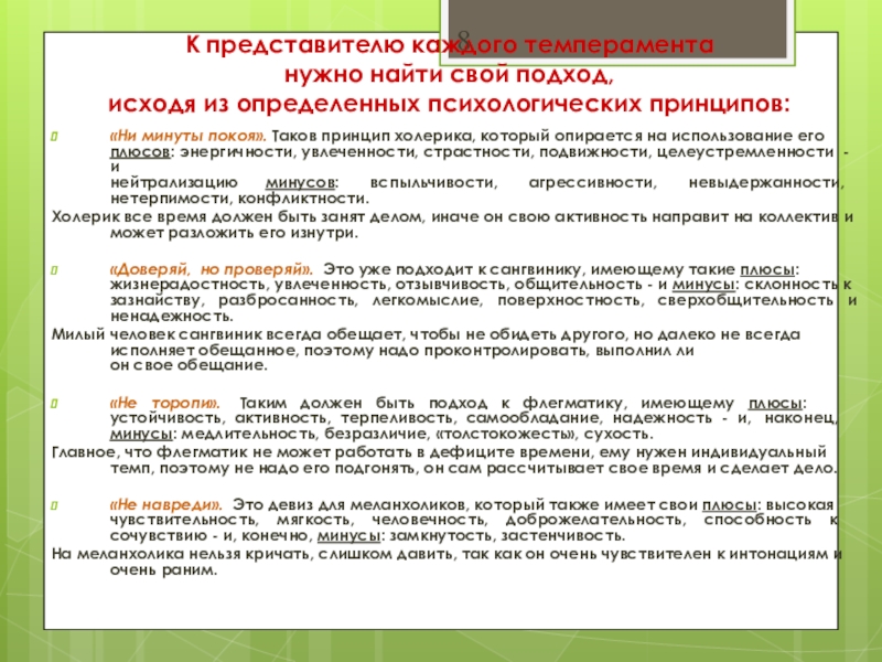 Главное, что флегматик не может работать в дефиците времени, ему нужен индивидуальный темп, поэтому не надо его подгонять, он сам рассчитывает свое время и сделает дело.