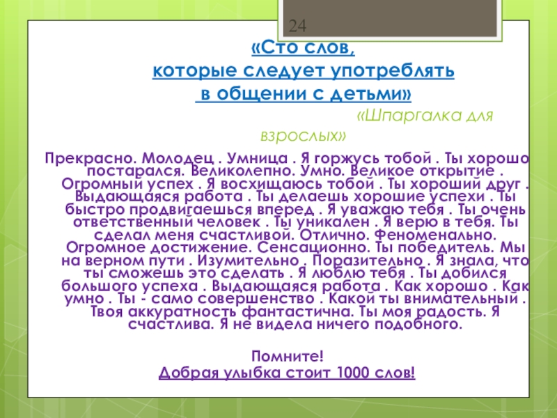 Прекрасно. Молодец . Умница . Я горжусь тобой . Ты хорошо постарался. Великолепно. Умно. Великое открытие . Огромный успех . Я восхищаюсь тобой . Ты хороший друг . Выдающаяся работа . Ты делаешь хорошие успехи . Ты быстро продвигаешься вперед . Я уважаю тебя . Ты очень ответственный человек . Ты уникален . Я верю в тебя. Ты сделал меня счастливой. Отлично. Феноменально. Огромное достижение. Сенсационно. Ты победитель. Мы на верном пути . Изумительно . Поразительно . Я знала, что ты сможешь это сделать . Я люблю тебя . Ты добился большого успеха . Выдающаяся работа . Как хорошо . Как умно . Ты - само совершенство . Какой ты внимательный . Твоя аккуратность фантастична. Ты моя радость. Я счастлива. Я не видела ничего подобного.
