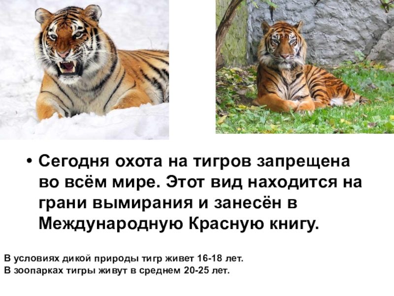 В условиях дикой природы тигр живет 16-18 лет. В зоопарках тигры живут в среднем 20-25 лет.