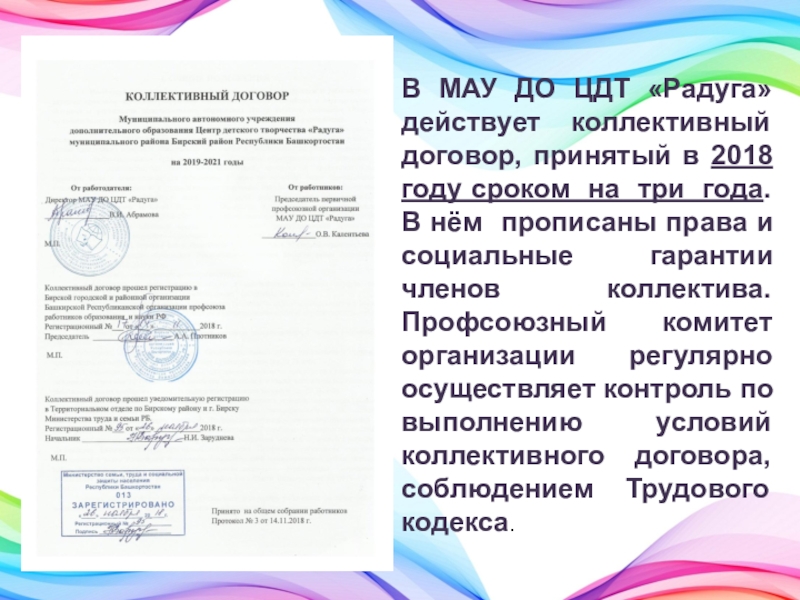 Слайд 7В МАУ ДО ЦДТ «Радуга» действует коллективный договор, принятый в 2018