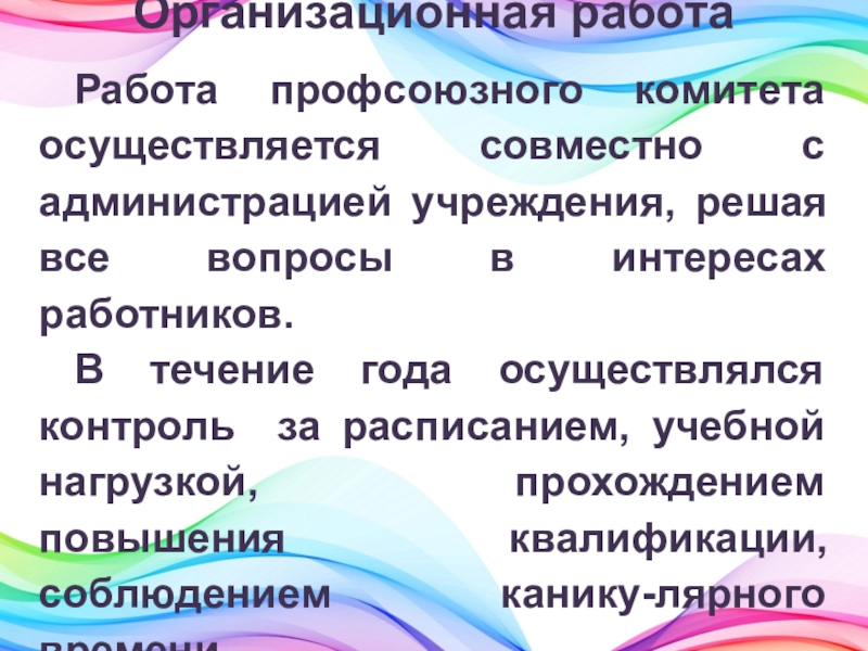 Организационная работаРабота профсоюзного комитета осуществляется совместно с администрацией учреждения, решая все вопросы в интересах работников.В течение года